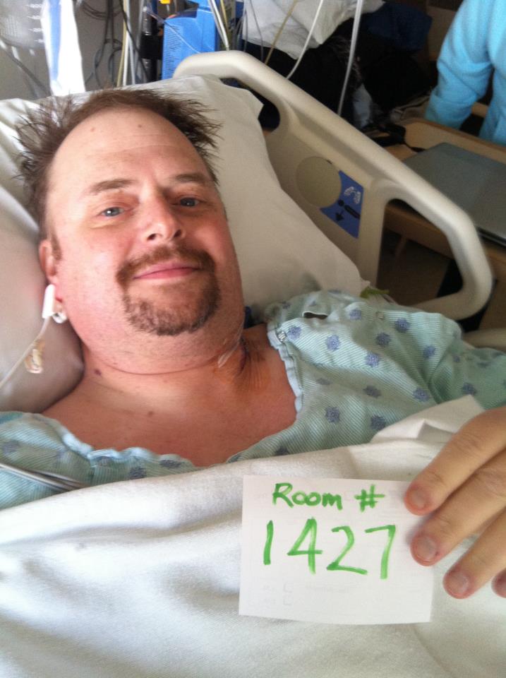 Feb. 22, 2013 -- I get a call about 6:30 a.m. from my friend Marcy who works at the U. She had just gotten off her shift and was visiting him. As she was about to leave, Karl had severe head pain and then a "staring seizure." Doctors decide to take him to get a CT scan. It revealed there was fluid in his brain. En route to the hospital, doctors called to tell me there was a serious change of condition for Karl. Upon arrival, Dr. Orringer is there to greet us. He tells us (by that time, "us" was Mom, Randy, Marcy, cousin Trese [who also works there], the chaplain and me) that there was little that could be done for Karl. He has hydrocephalus caused by cancer cells clogging the ability for his brain to drain. Normally, they are able to put a shunt that drains into the body, but because Karl has an open wound, they can't do that; he'd get Meningitus which would cause excruciating, uncontrollable pain. The other two options are to make him comfortable and he'd pass within 24 to 48 hours or put a smaller drain in, which would give him 48 to 72 hours. Karl was very lucid and chose to be able to say goodbye.